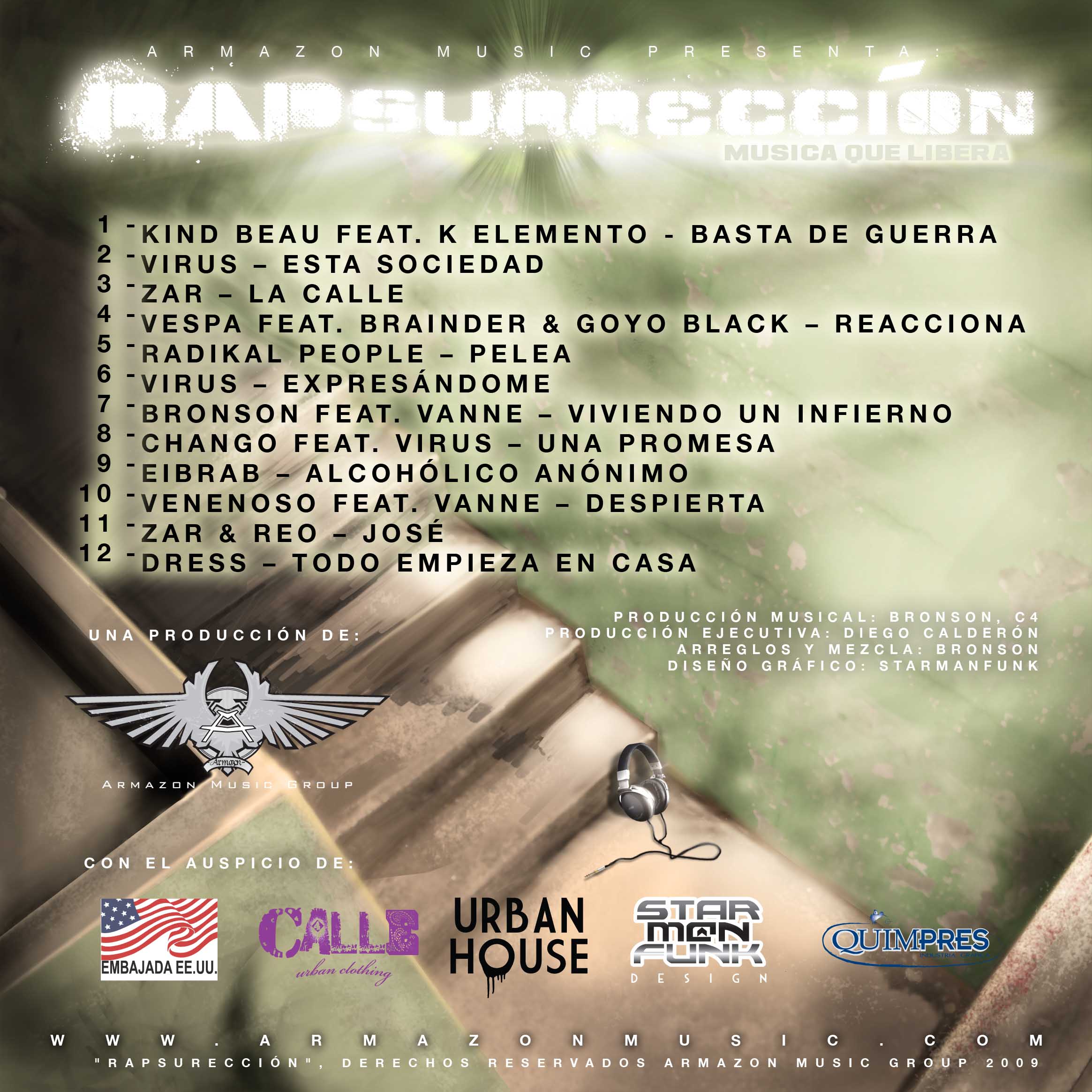 RAPSURRECCIÓN, presenta 12 tracks totalmente inéditos, compuestos y producidos 100% por artistas ecuatorianos, además de la participación de Radikal People desde Lima – Perú con el tema “Pelea”. El trabajo discográfico fue producido y grabado en los estudios de Armazon Music Group entre mayo y septiembre del 2009, en donde se puede encontrar apariciones de los principales y más destacados exponentes del país, con excelentes versos que potencian la extraordinaria producción musical de nuestros productores principales; Bronson & C4. Este proyecto, se origina en una colaboración sin precedentes entre Armazon Music Group y la Embajada de los Estados Unidos, con el apoyo de la Dirección Provincial de Educación de Pichincha, y la Secretaria Municipal de Educación, gracias a quienes se complementa el mensaje con charlas educativas en varios colegios del país, en donde se hará la distribución gratuita de 5.000 copias del disco, gracias a nuestros auspiciantes. |